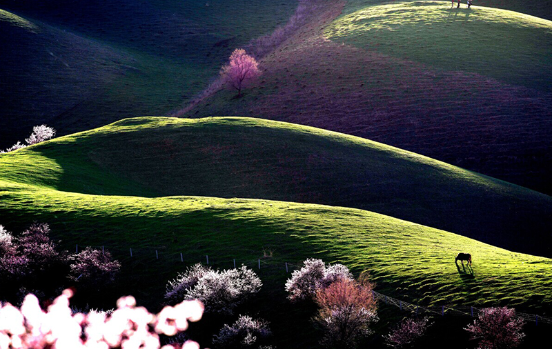 4、杏花沟看似景色单一,但一定要仔细用心去看,如果时间允许,建议用一整天的时间游玩。若当天来得及可直接上山,欣赏完落日余晖后下山。第二天早晨8点赶到景区观赏日出,赏景拍照。不要只在山脊上观景赏花,最好下到沟底,然后走到对面山梁,一路可以近距离接触杏花、牛羊、牧舍,或者静静的坐在树下,等待春风吹落杏花飘飘洒洒的那一刻。