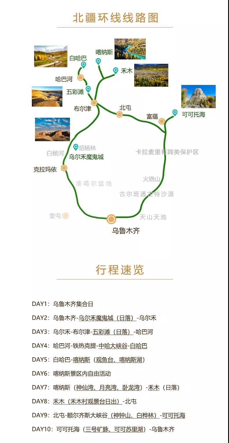 可可托海、可可苏里湖、三号矿脉、额尔齐斯大峡谷、白沙湖、边境第一连、白哈巴、喀纳斯、禾木、五彩滩、魔鬼城、安集海大峡谷