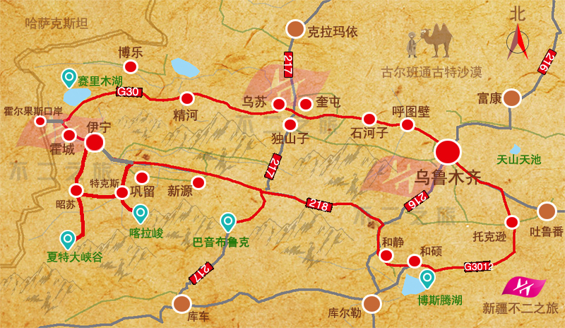 赛里木湖、果子沟、霍城薰衣草、昭苏、夏特大峡谷、特克斯八卦城、喀拉峻草原、巴音布鲁克草原、吐鲁番、火焰山、葡萄沟、火焰山大峡谷、库木塔格沙漠