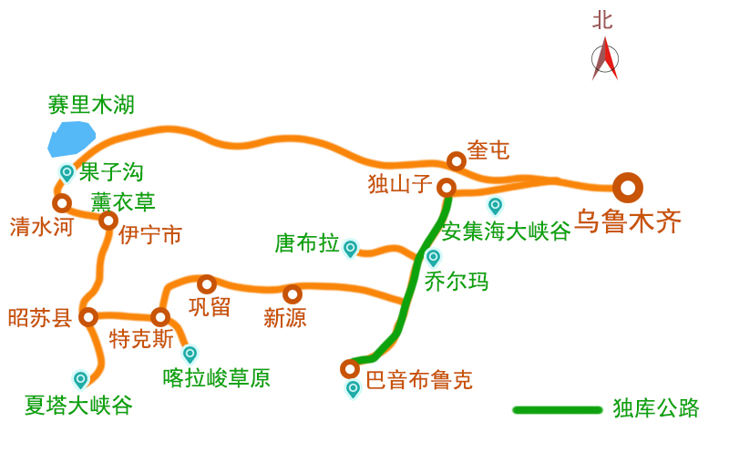 赛里木湖、果子沟、霍城薰衣草、伊昭公路、夏特大峡谷、特克斯八卦城、喀拉峻草原、巴音布鲁克草原、独库公路、乔尔玛、百里画廊唐布拉、安集海大峡谷